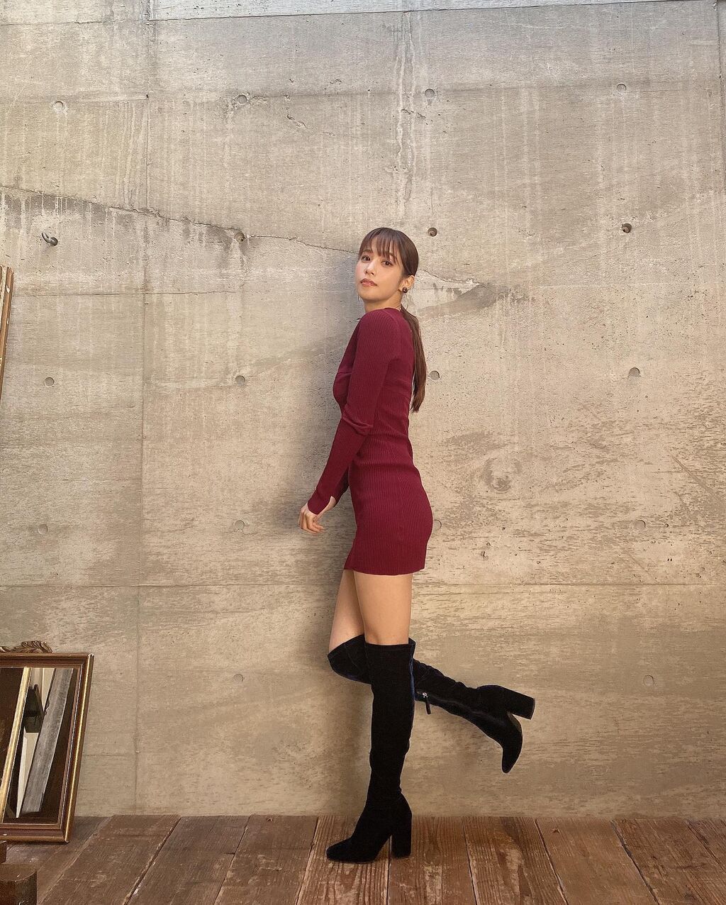 ワインレッドのワンピースにニーハイブーツという“絶対領域”がまぶしいコーデ。